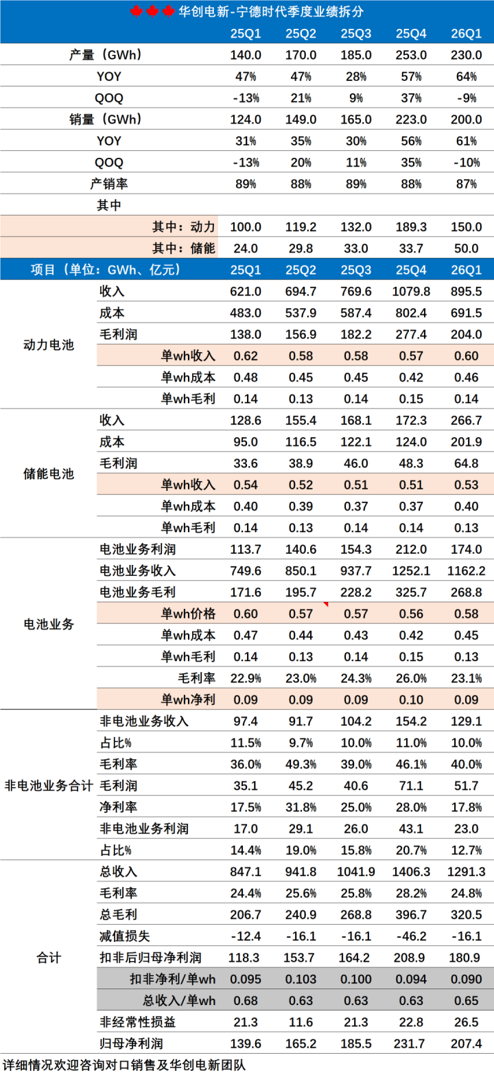 宁德时期2026年Q1营收1291亿元,同比增长52.45%;净利润207亿元,同比增长48.52%。同期,公司浮现能源+储能电板销量朝上200GWh,其中储能占比25%;全球能源电板市占率达到40.5%,较此前普及1.8pct,国内装机市占率达到47.7%,普及3.4pct。