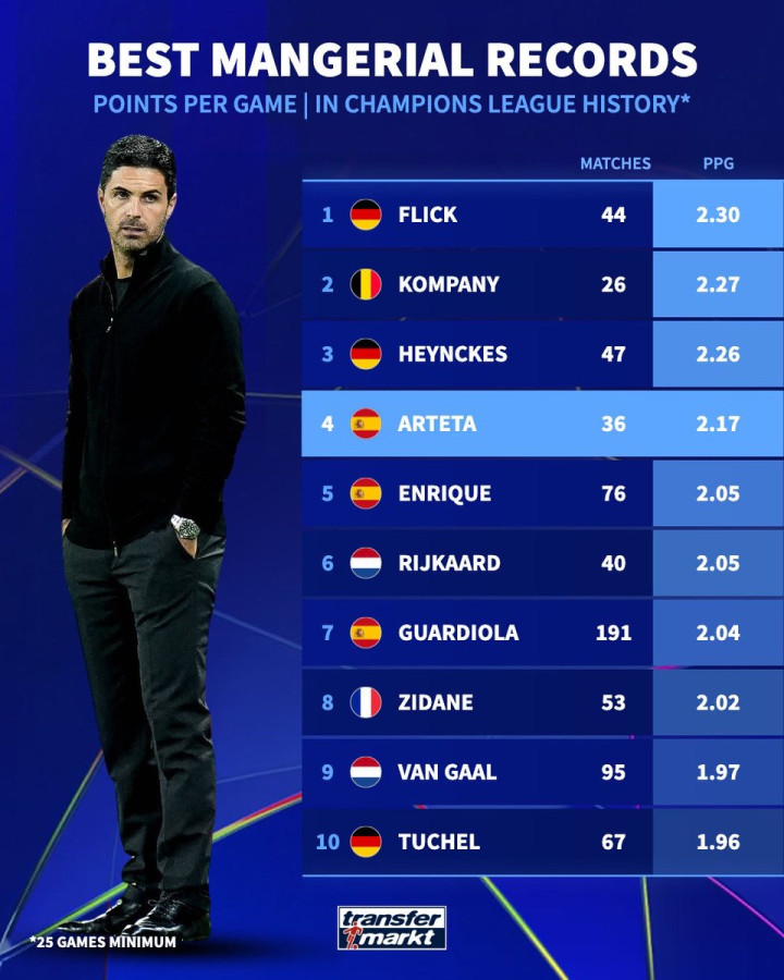 虎扑04月15日讯德转统计了主帅欧冠场均积分榜(至少抓教25场)。