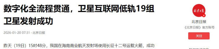 1月19日15时48分,长征十二号运载火箭点火升空,橘红色的尾焰划破南海之滨的天空,成功将卫星互联网低轨19组卫星送入预定轨道,发射任务圆满成功。