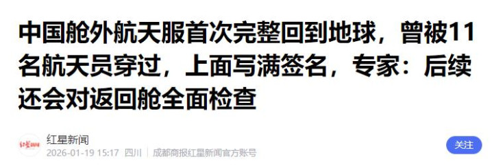 红星新闻-2026-01-19——《中国舱外航天服首次完整回到地球,曾被11名航天员穿过,上面写满签名,专家:后续还会对返回舱全面检查》